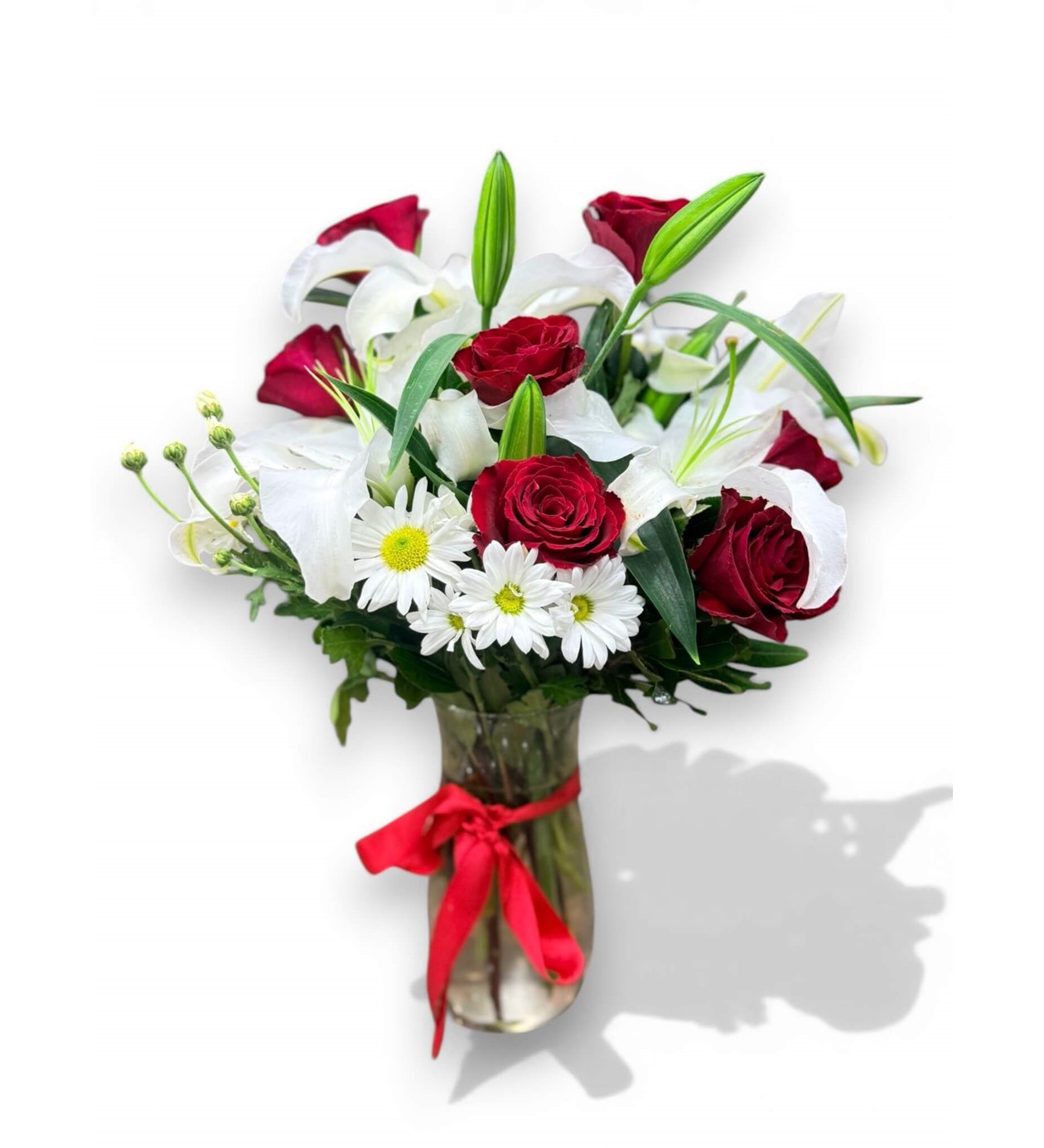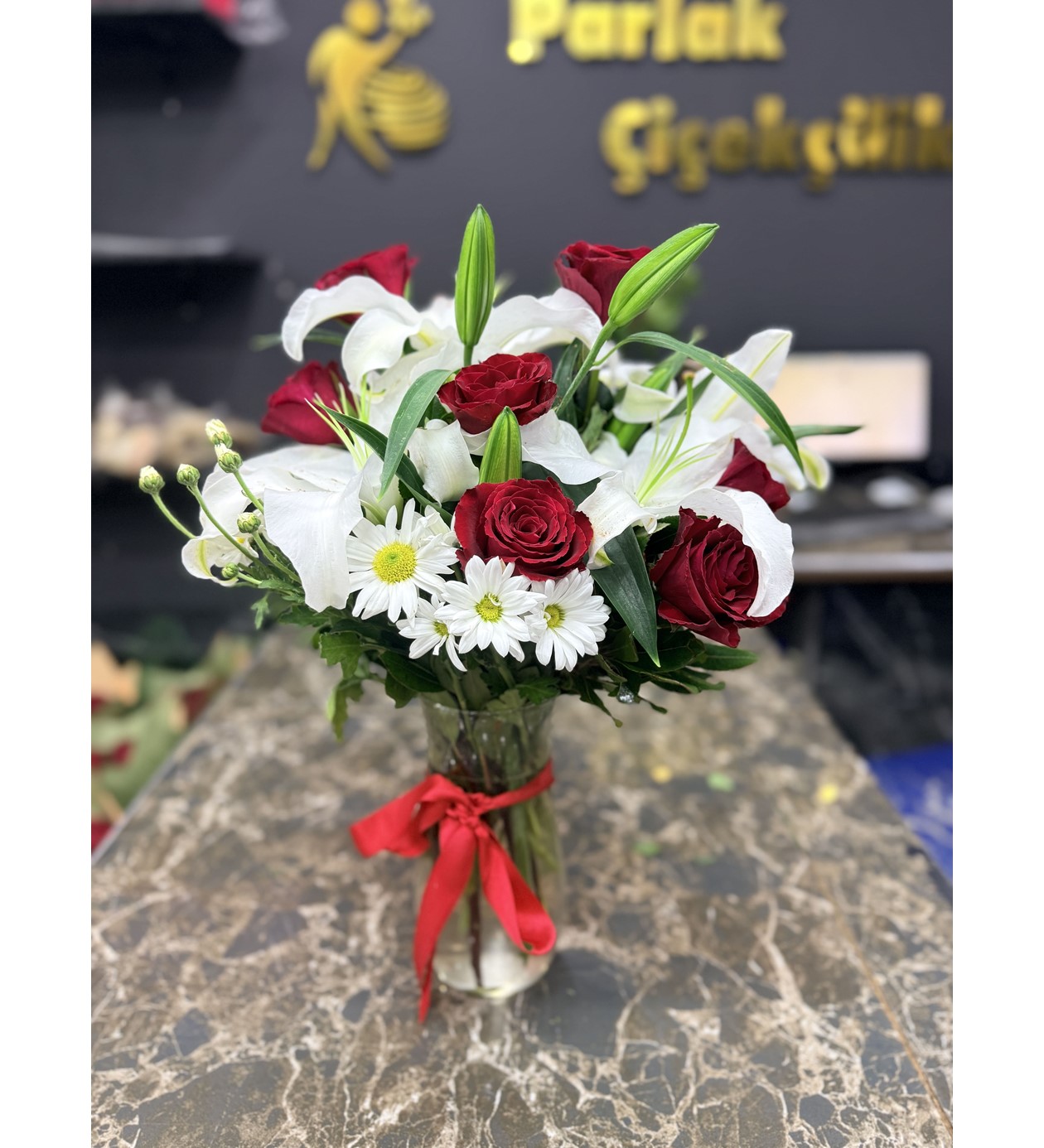 Sevdiklerinize en saf duygularınızı ifade etmenin en zarif yolu! Özel tasarım şeffaf cam vazosunda sunulan bu premium aranjman, kırmızının tutkusunu ve beyazın asaletini bir araya getiriyor. Merkezde yer alan en kaliteli kırmızı güller, çevresini saran mis kokulu beyaz lilyumlar (zambaklar) ve neşeli dokunuşlarıyla beyaz papatyalar, görsel bir şölen sunuyor.