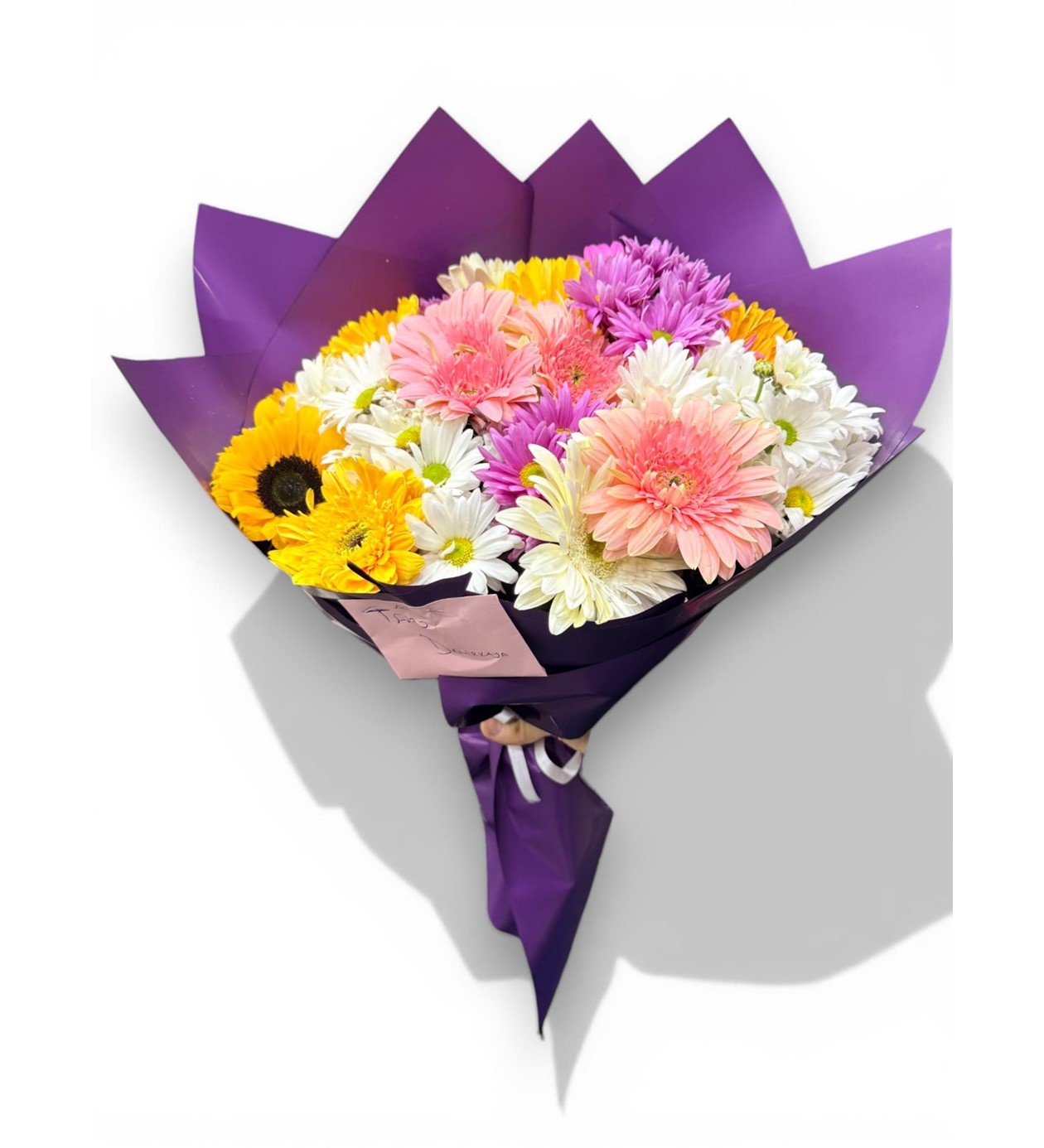 Sevdiklerinize doğanın en içten gülümsemesini gönderin! Renkli Mevsim Buketi, mevsimin en taze pembe, sarı ve beyaz gerberalarını, zarif papatyalarla harmanlayarak görsel bir şölen sunuyor. Mor renkli premium ambalaj kağıdı ile modernize edilen bu buket, sadece bir çiçek değil, aynı zamanda mutluluğun en canlı halidir.