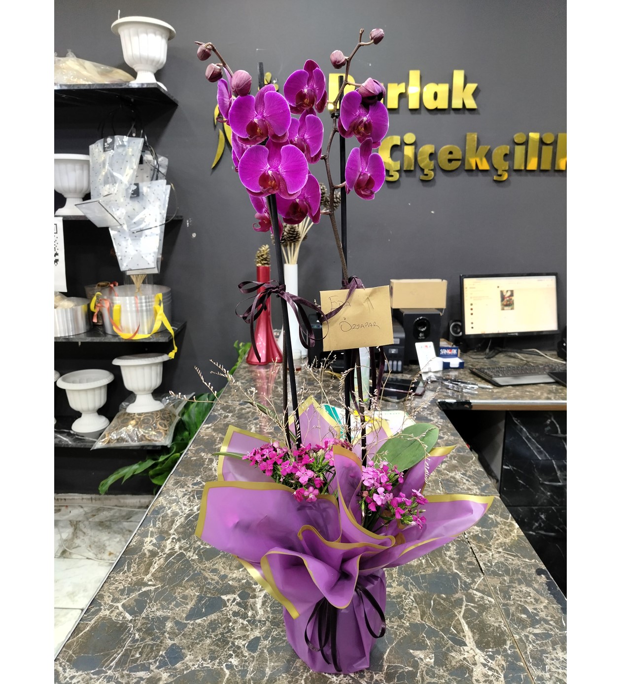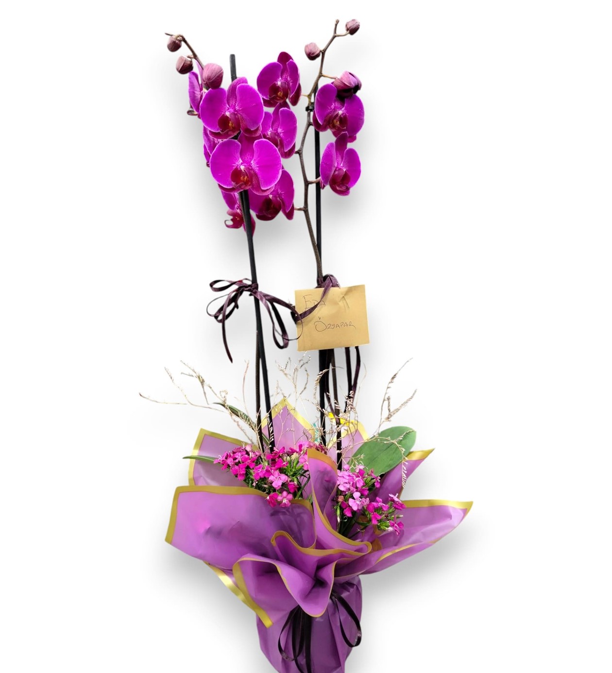 Sevginizi ve hayranlığınızı ifade etmenin en şık yolu olan bu özel aranjman, büyüleyici fuşya tonlarındaki orkideleri modern bir sunumla birleştiriyor. Çift dalın görkemi ve alt kısımdaki taze çiçek dokunuşlarıyla, bu tasarım standart bir çiçekten çok daha fazlasını sunuyor.