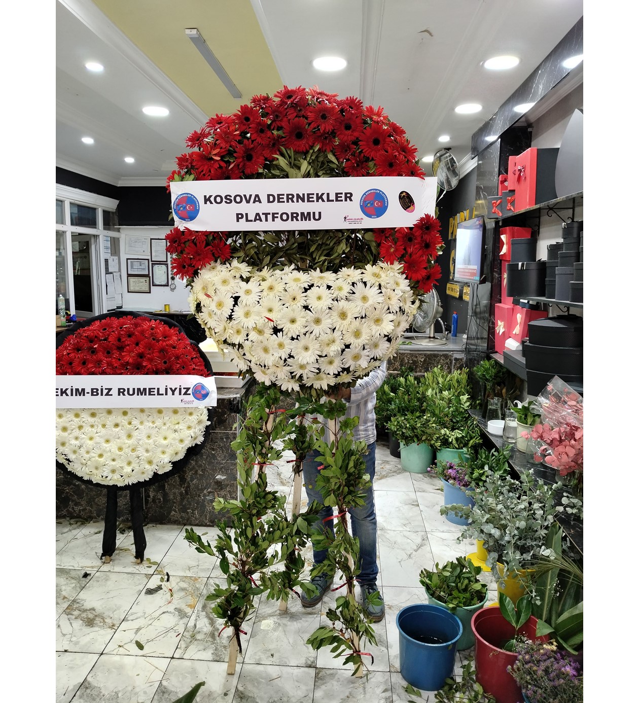 Çiçekler: Kırmızı ve Beyaz Gerberalar, Mevsimlik Yeşillikler.