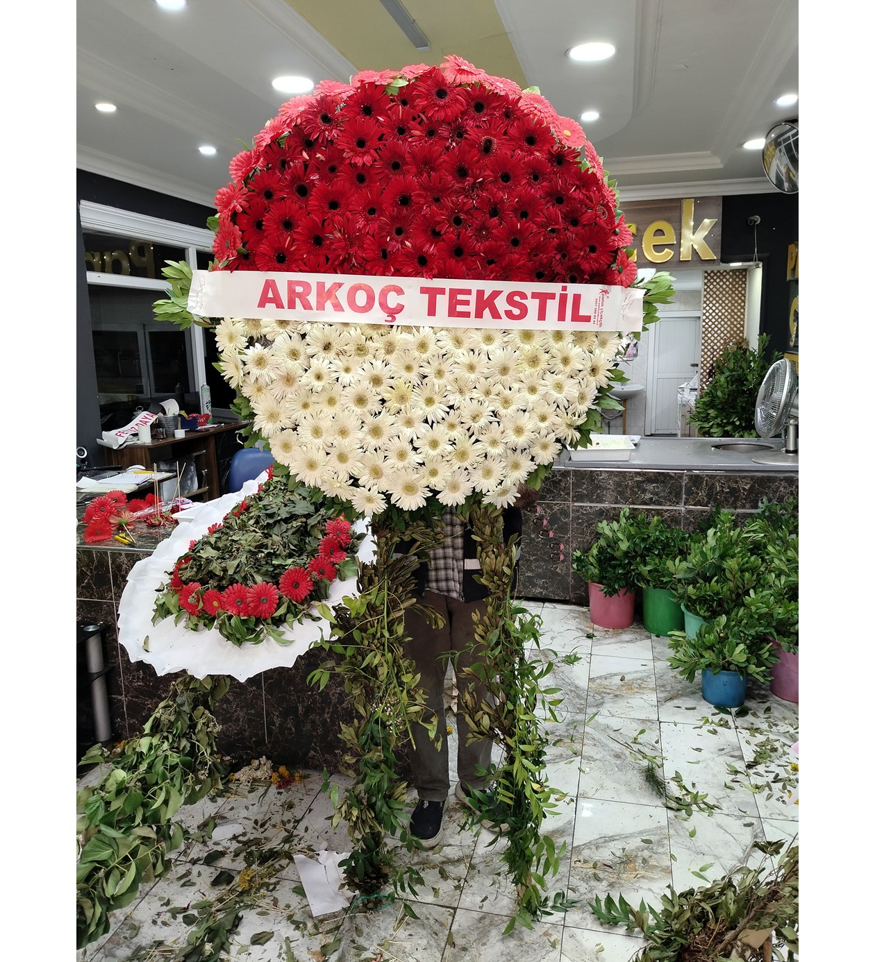 Çiçekler: Birinci sınıf Kırmızı Gerberalar, Beyaz Gerberalar ve Mevsimlik Garnitürler.