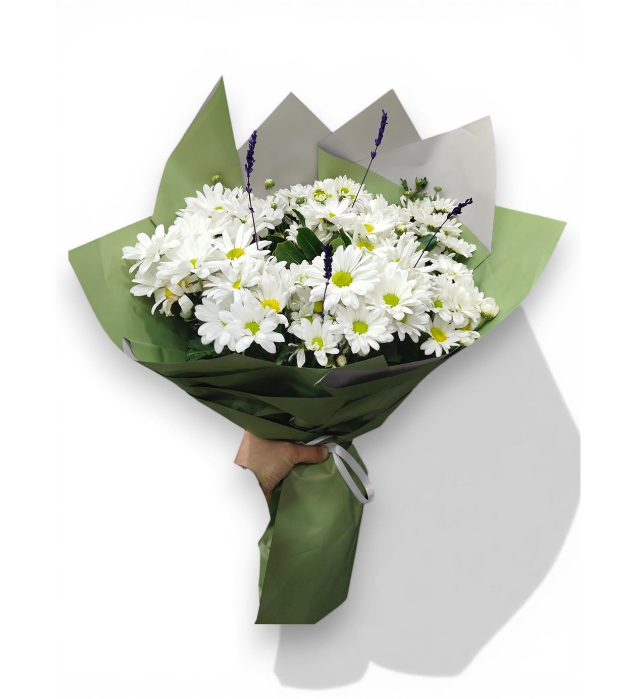 Dolgun ve Taze Görünüm: Buketlerimiz, bol miktarda iri kafa beyaz papatya (krizantem) kullanılarak zengin ve hacimli bir yapıda hazırlanır.