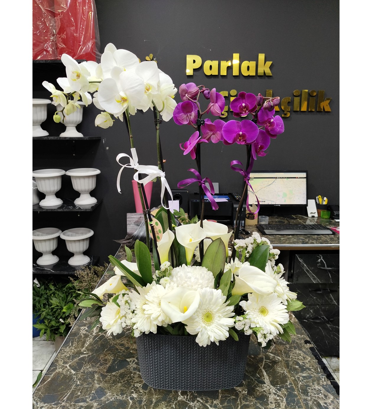 Hayatın en özel anlarını kutlamak için asalet ve enerjiyi tek bir saksıda buluşturduk. Saf beyaz orkidelerin huzuru ile canlı fuşya/pembe orkidelerin neşesini bir araya getiren bu grup aranjman, sevdikleriniz için unutulmaz bir hediye seçeneği sunuyor.