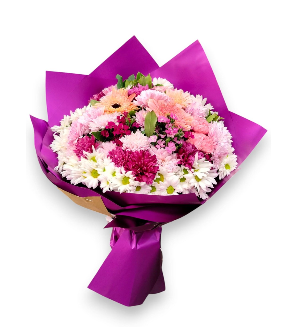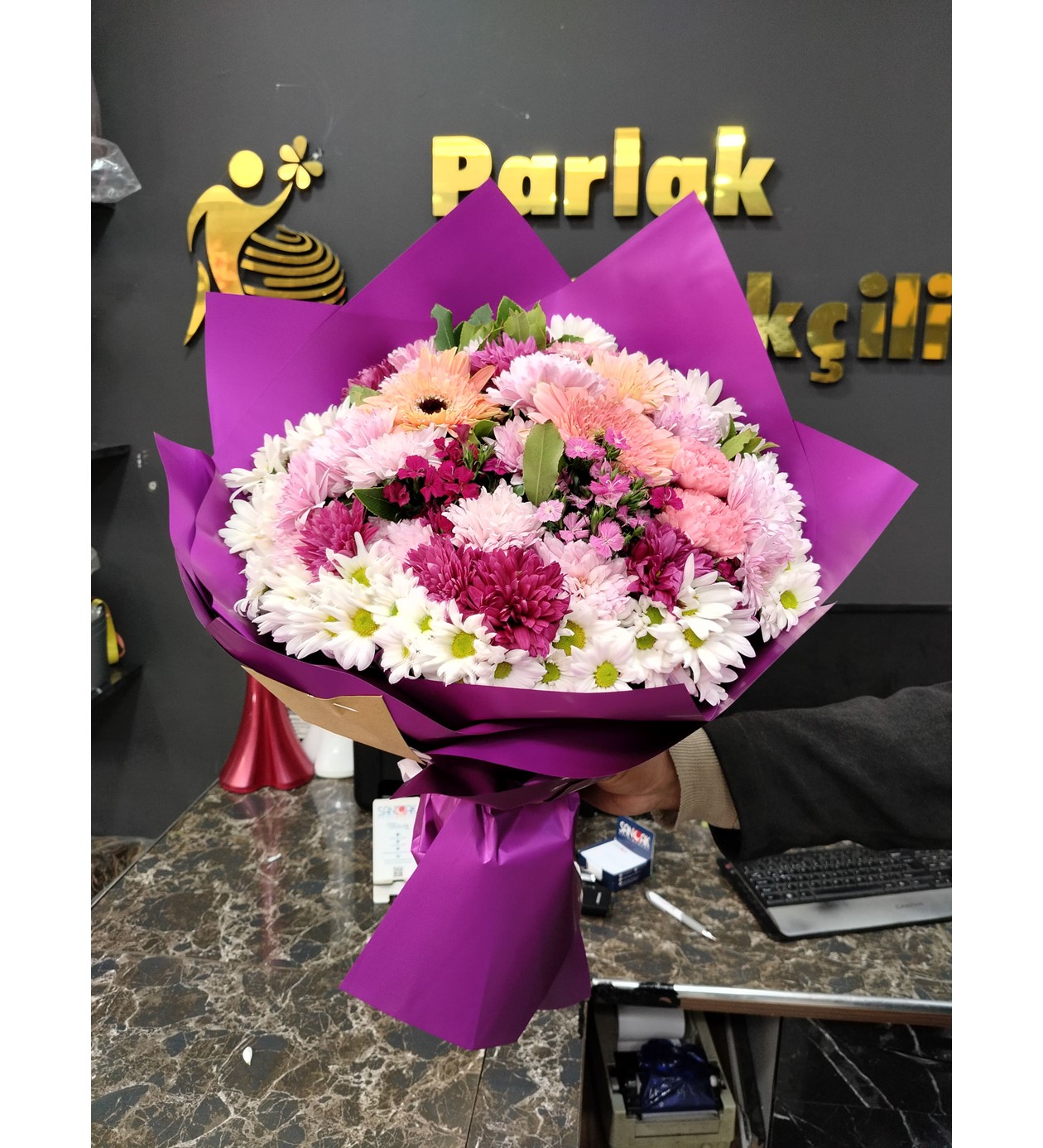Doğanın tüm enerjisini sevdiklerinizin evine taşıyın! Renkli Mevsim Çiçekleri Buketi, en taze sarı, pembe ve beyaz gerberaları, mevsimin en canlı papatyalarıyla bir araya getiriyor. Modern çift katlı mor ve pembe lüks ambalajı ile sunulan bu aranjman, görsel bir mutluluk kaynağıdır.