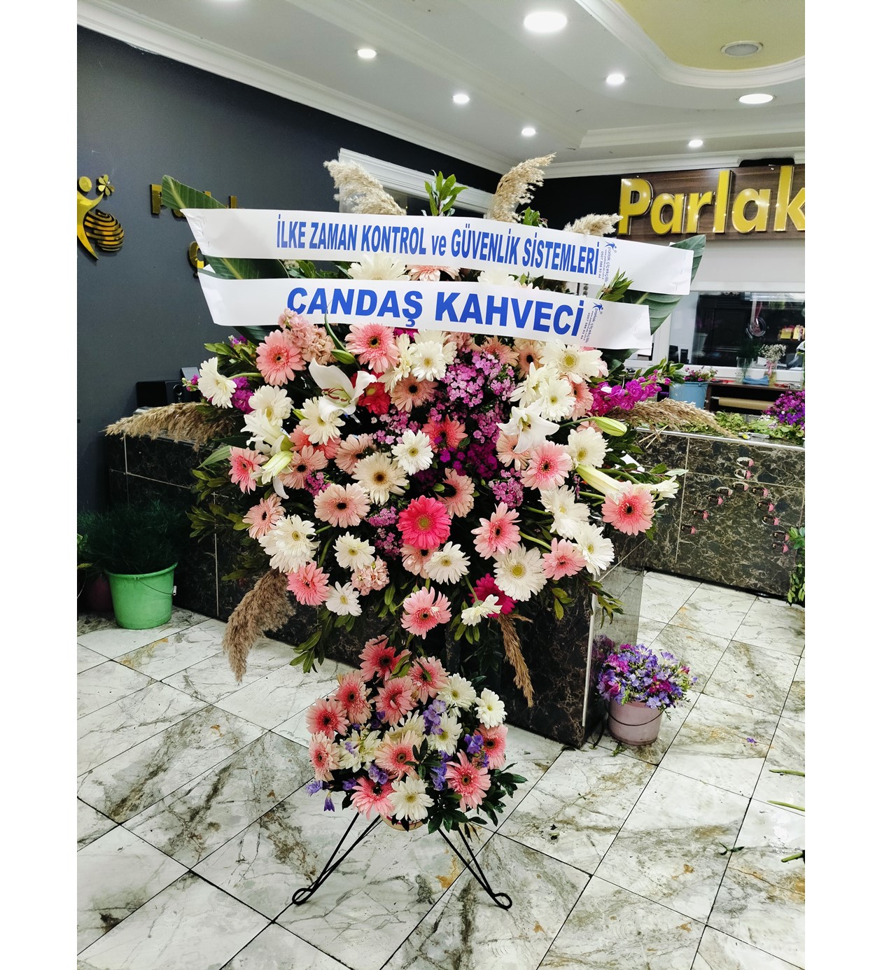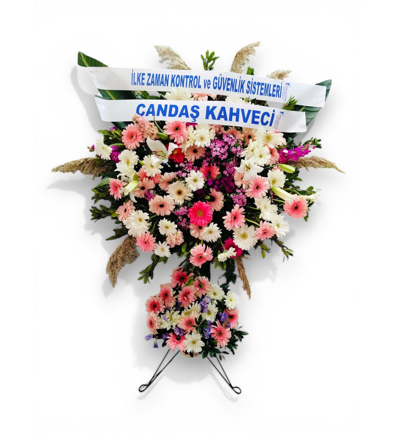 Çiçek İçeriği: Pembe ve Beyaz Gerberalar, Beyaz Lilyumlar (Zambaklar), Mor Krizantemler ve Mevsimlik Dolgu Çiçekleri.