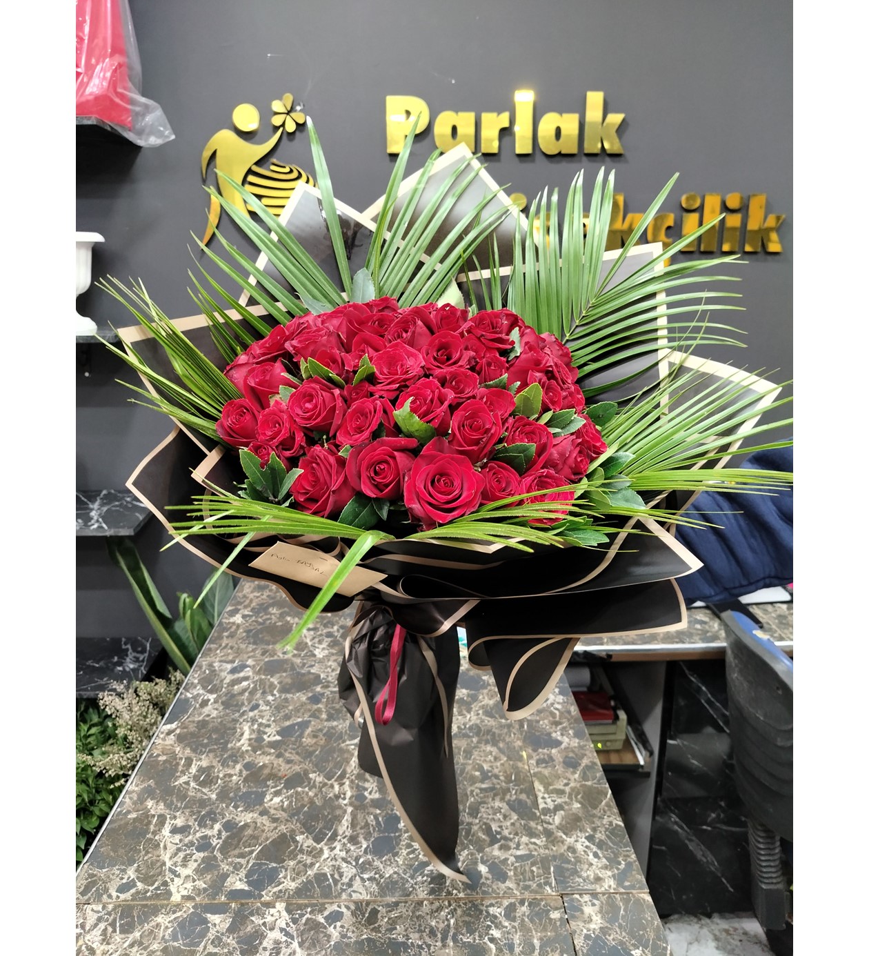 Derin bir sevginin en şık ifadesi! Özenle seçilmiş 51 adet ithal kırmızı gül ile hazırlanan bu görkemli buket, sevginizin büyüklüğünü anlatmanın en asil yolu. Doğal kraft kağıt ambalajı ve şık siyah kurdele detayıyla modern bir dokunuş kazanan bu tasarım, her bir gülün tazeliği ve dolgunluğu ile göz kamaştırıyor.