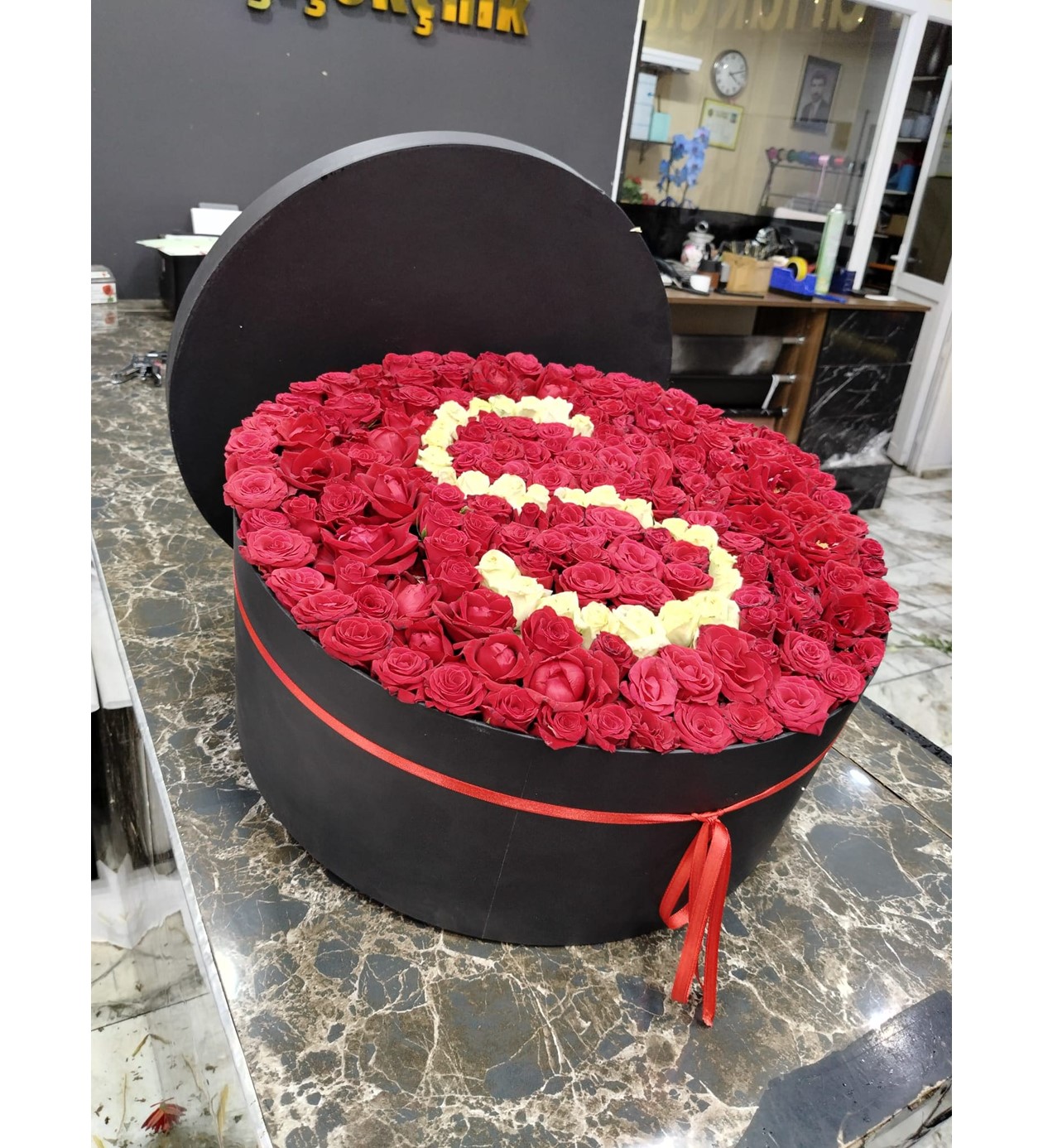 Sıradan hediyelerin ötesine geçmek isteyenler için 30 yıllık sektör tecrübemizle en görkemli tasarımı hazırladık. Birinci sınıf taze kırmızı güllerin merkezine, beyaz güllerle işlenen baş harf detayı; bu tasarımı sadece bir çiçek değil, unutulmaz bir anı haline getiriyor.