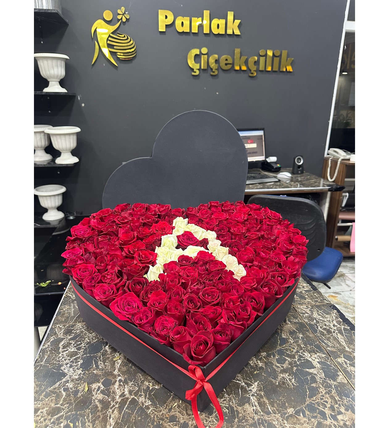 Sektördeki 30 yıllık köklü tecrübemizle, romantizmi ve asaleti dev bir kalp kutuda buluşturuyoruz. Birinci sınıf taze kırmızı güllerin arasına bembeyaz güllerle işlenen baş harf detayı, bu tasarımı sıradan bir hediye olmaktan çıkarıp tamamen size özel bir sanat eserine dönüştürüyor.