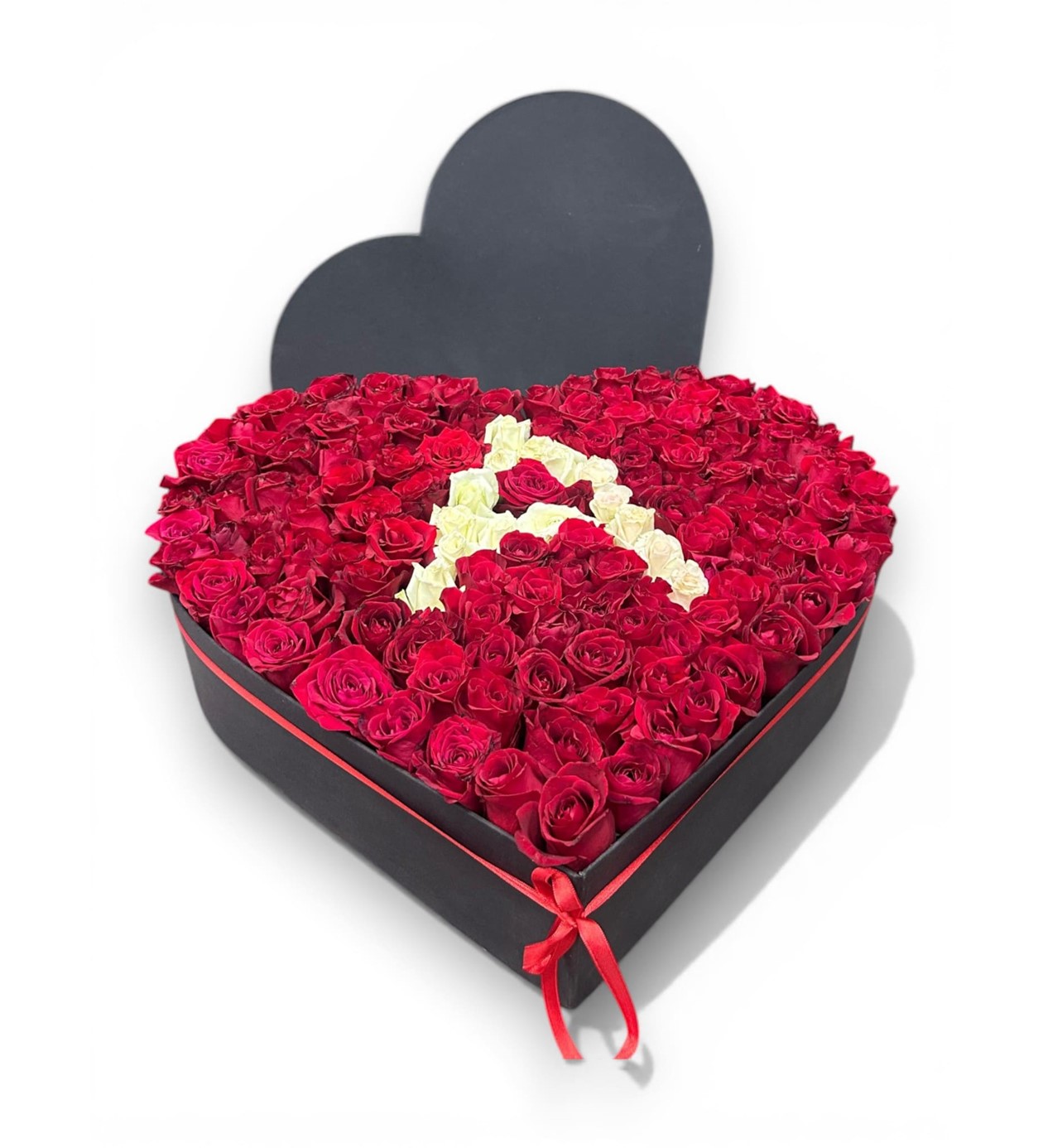 Kişiselleştirilmiş Baş Harfi: Kırmızı güllerin yarattığı tutkulu zemin üzerine beyaz güllerle titizlikle işlenen harf detayı, mesajınızı en zarif şekilde iletir.