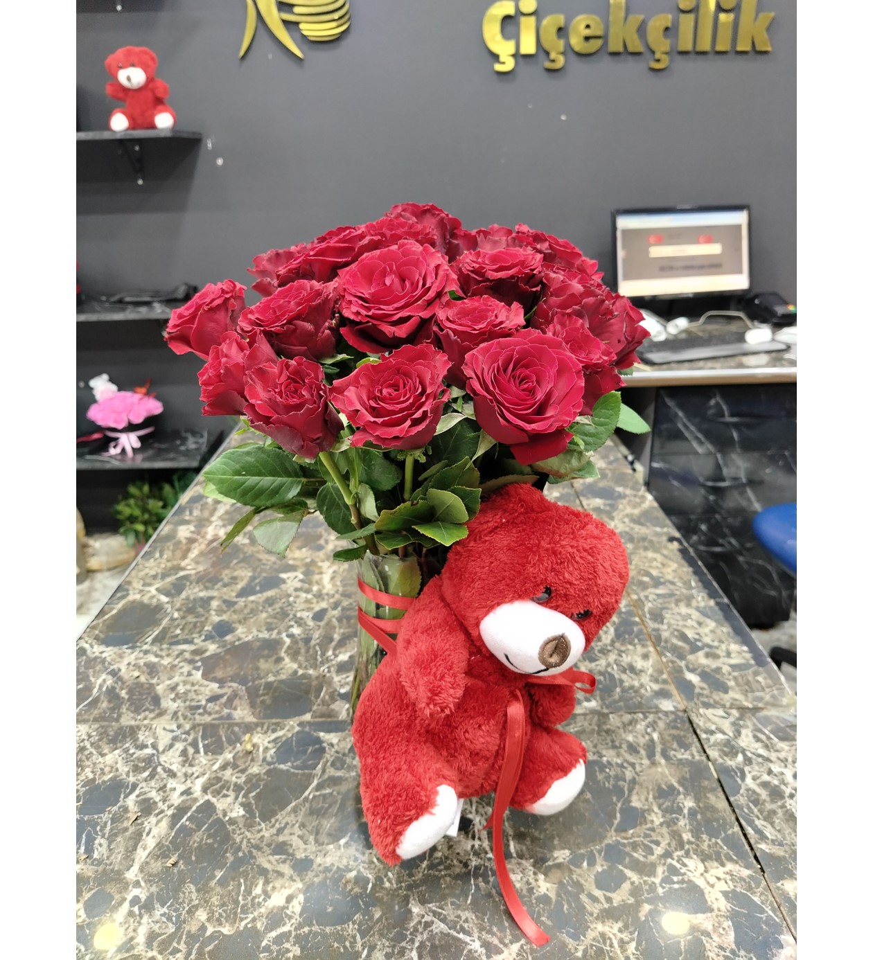Aşkın en saf hali, en sevimli dostla buluştu! Özenle seçilmiş 15 adet taze kırmızı gül, şık bir cam vazo içerisinde profesyonelce düzenlenmiştir. Vazonun yanına eşlik eden kırmızı peluş ayıcık, bu hediyeye unutulmaz bir şirinlik katıyor.