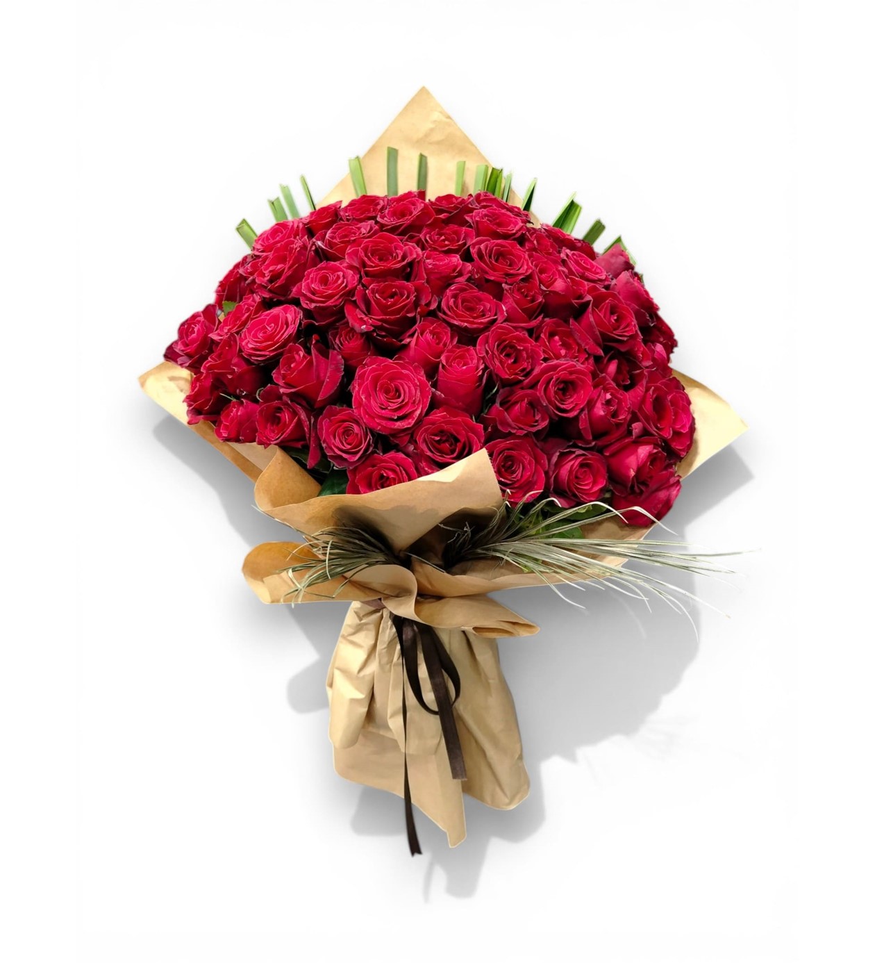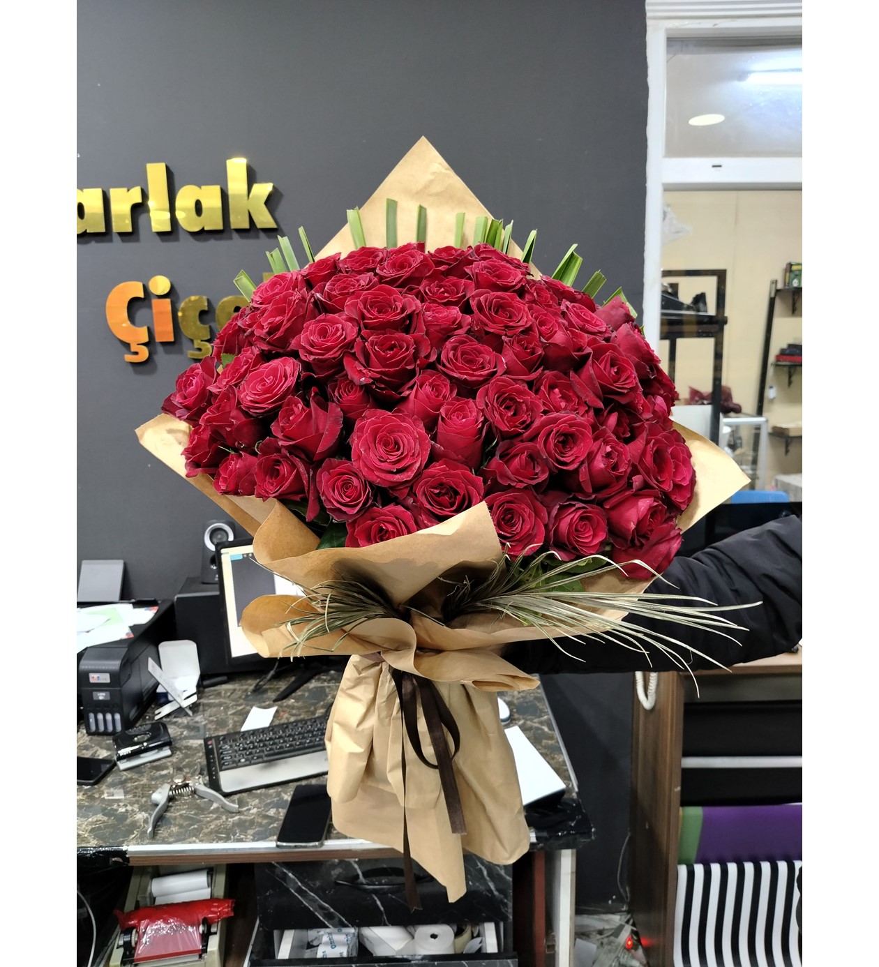 Sevginizin büyüklüğünü anlatmanın en ihtişamlı yolu! Özenle seçilmiş, iri kafa ve kadifemsi dokulu 51 adet ithal kırmızı gül, doğallığı simgeleyen kraft ambalaj içerisinde sanata dönüşüyor. Buketin arkasındaki yeşil detaylar ve özel bağlama tekniği, güllerin canlılığını ve zarafetini ön plana çıkarıyor.