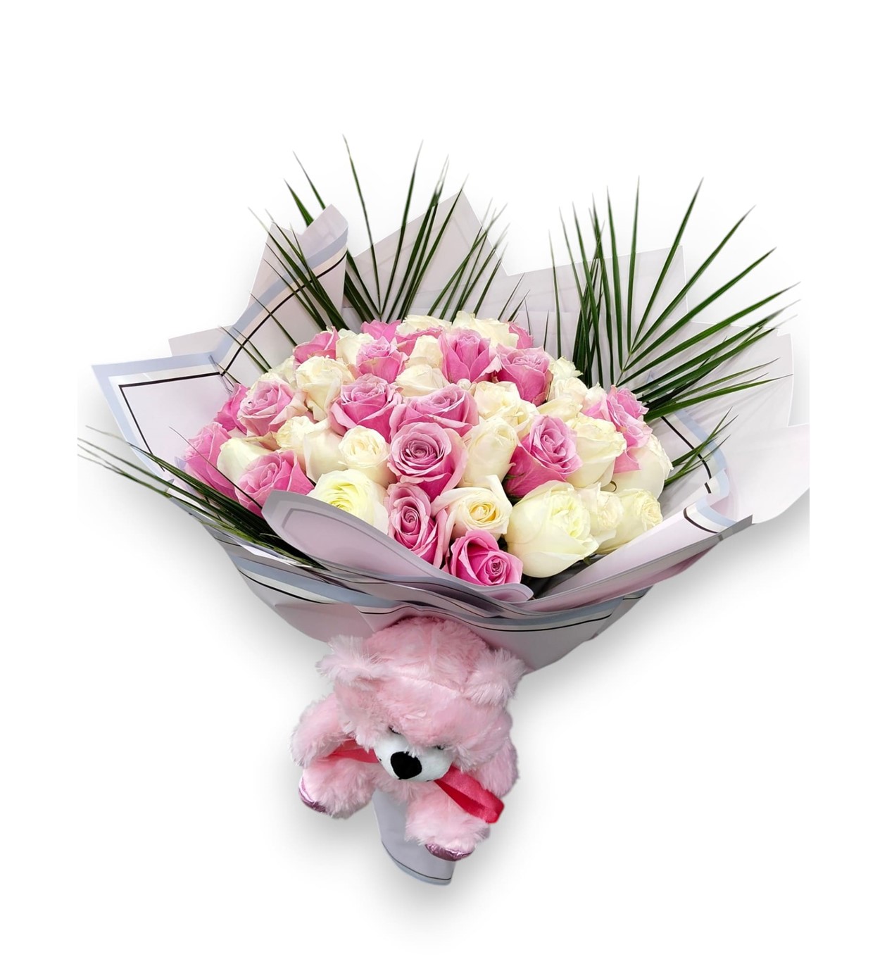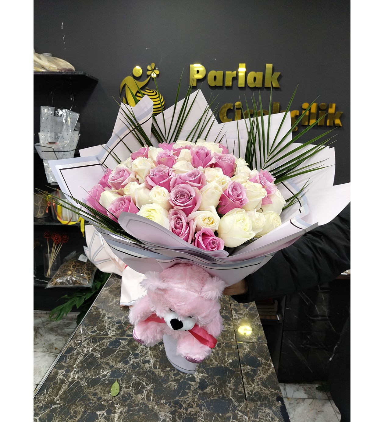 Zarafeti ve sevimliliği bir arada sunan muhteşem bir hediye! En kaliteli 51 adet ithal pembe ve beyaz gül, modern sunumuyla sevdiklerinizi büyülemeye hazır. Buketin çevresini saran egzotik palmiye yaprakları aranjmana modern bir hava katarken, sap kısmına eklenen yumuşacık pembe peluş ayıcık bu şık hediyeye unutulmaz bir sevimlilik katıyor.