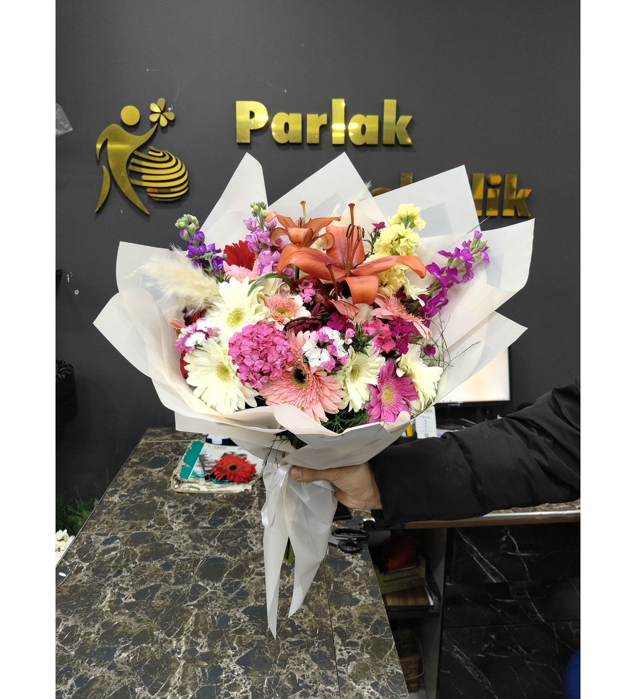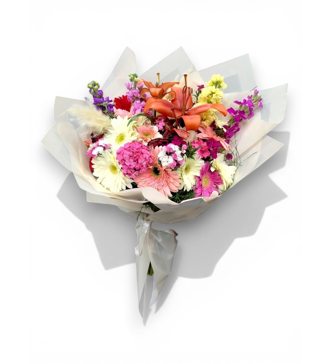 Çiçek İçeriği: Taze beyaz lilyum (zambak), şebboylar, pembe gerberalar ve mevsim yeşillikleri.