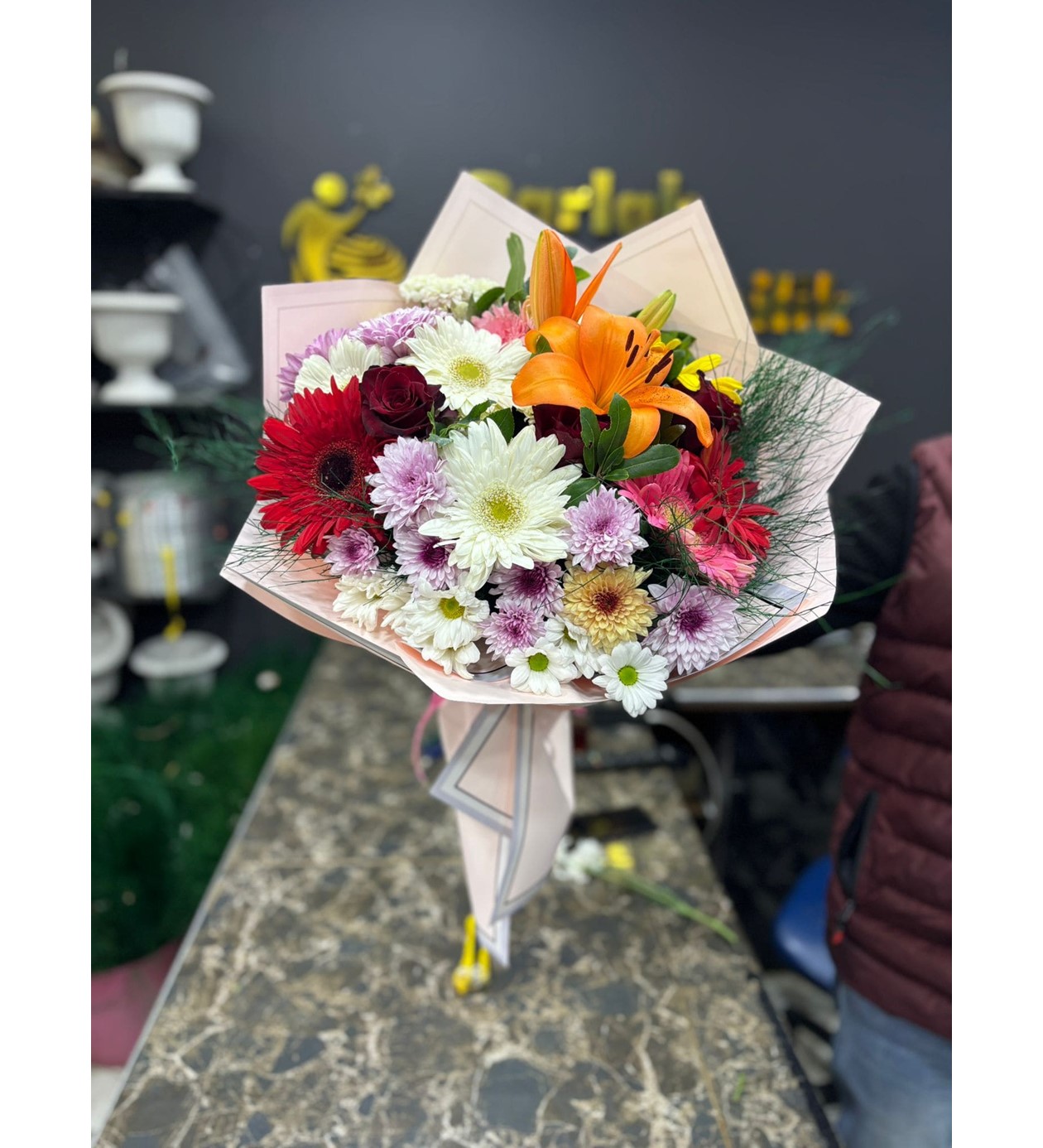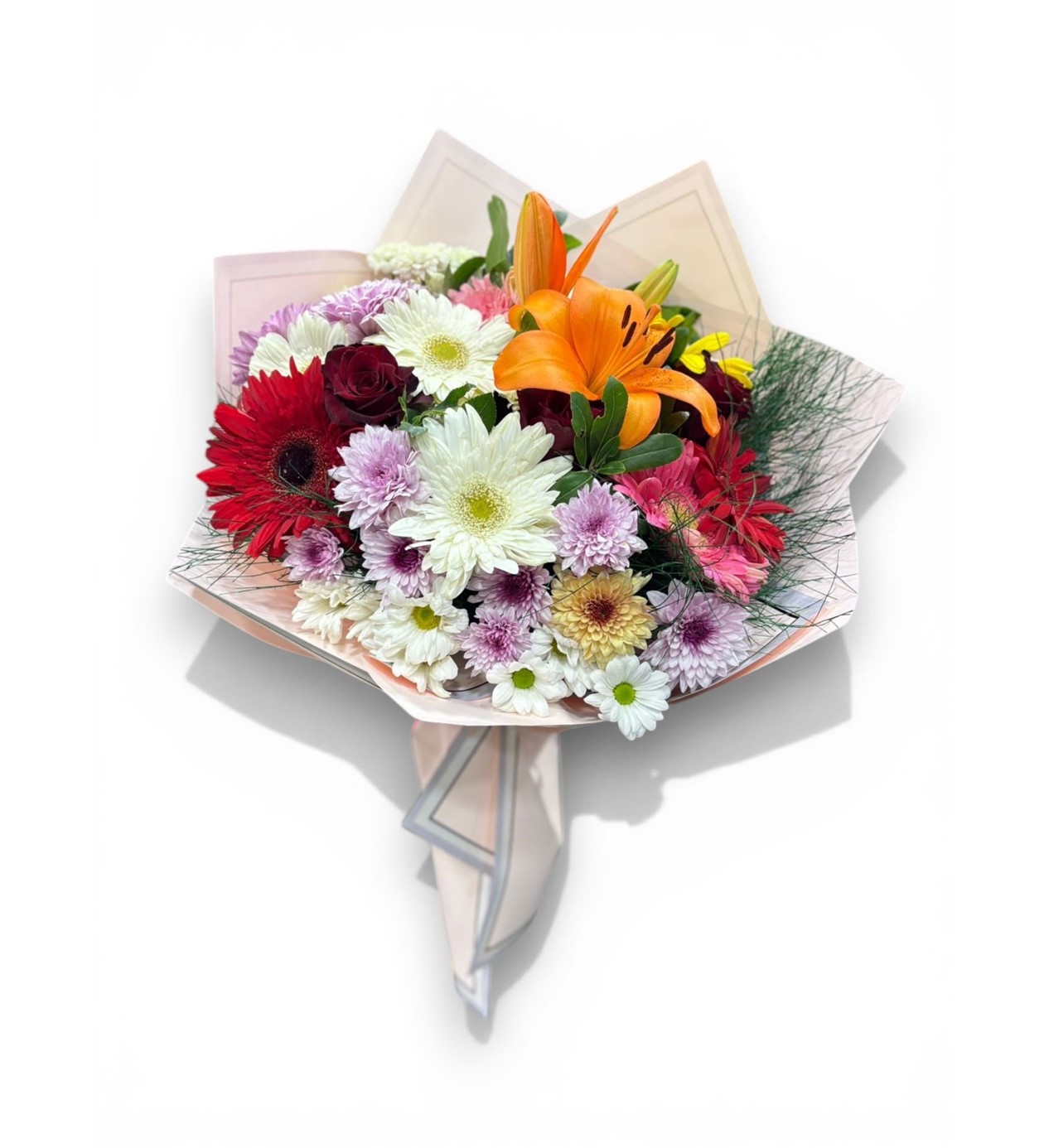 Zengin İçerik: Turuncu Lilyum (Zambak), Kırmızı Gerbera, Renkli Krizantemler.