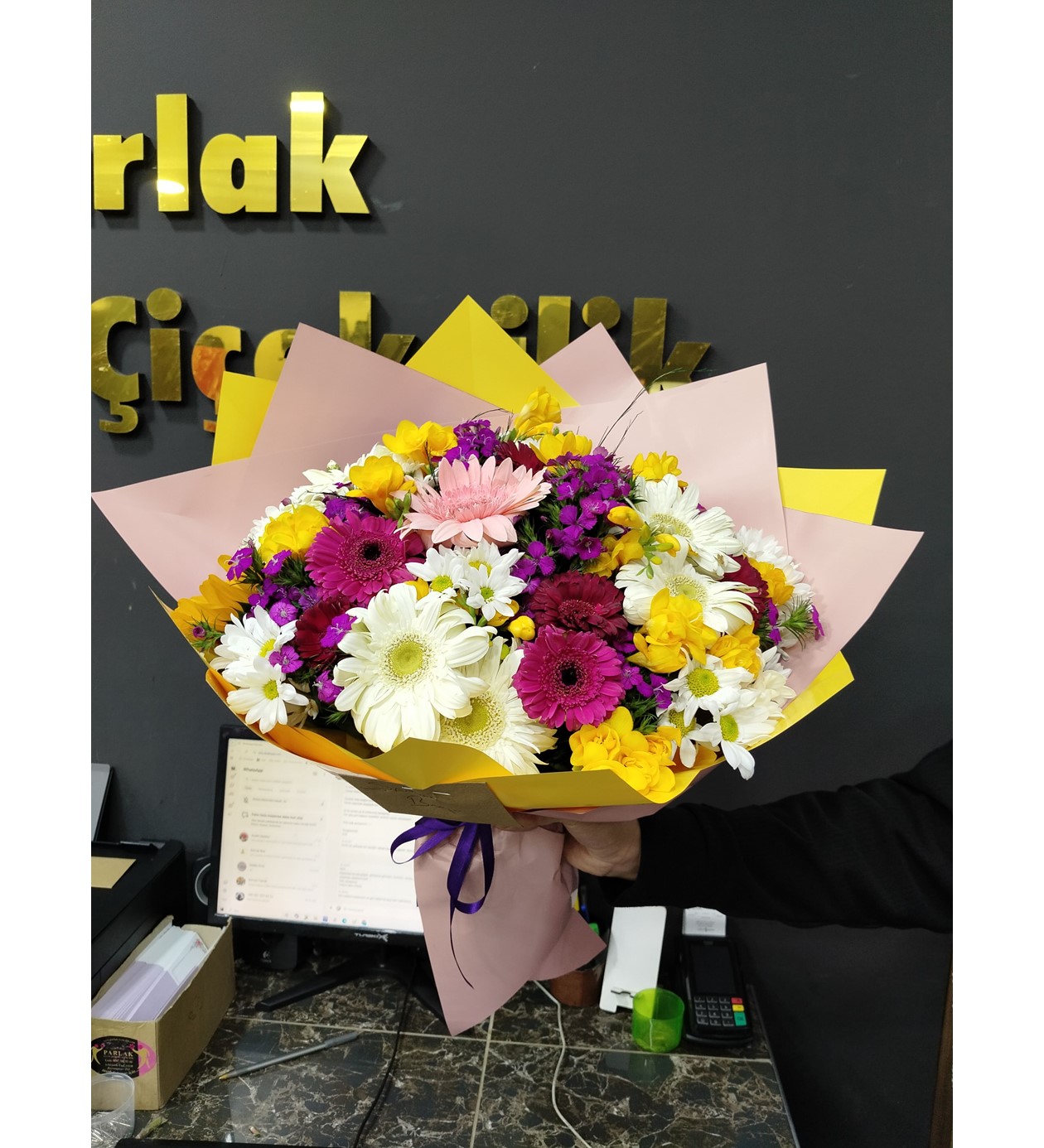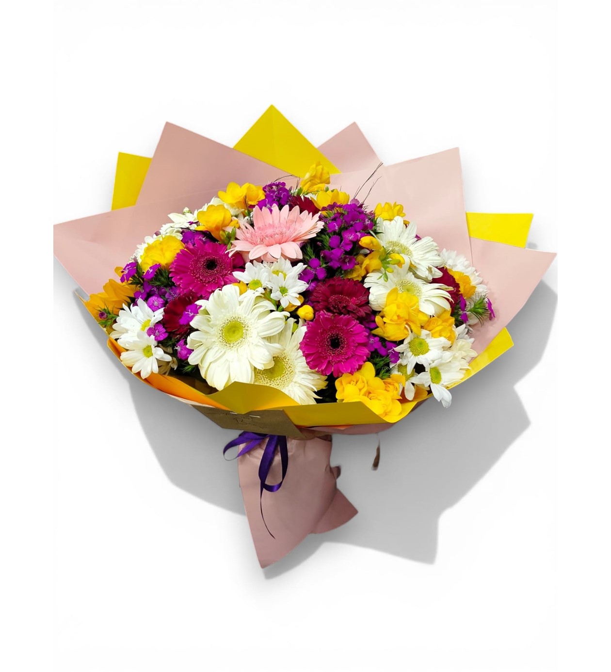 Sevdiklerinizin gününü aydınlatacak bir renk cümbüşü! Rengarenk Mevsim Çiçekleri Buketi, en taze pembe ve fuşya gerberaları, güneş gibi parlayan sarı frezyaları ve masum beyaz papatyaları bir araya getiriyor. Modern ve dikkat çekici sarı-pembe lüks ambalajı ile sunulan bu dolgun aranjman, doğanın en pozitif renklerini mekanlara taşıyor.
