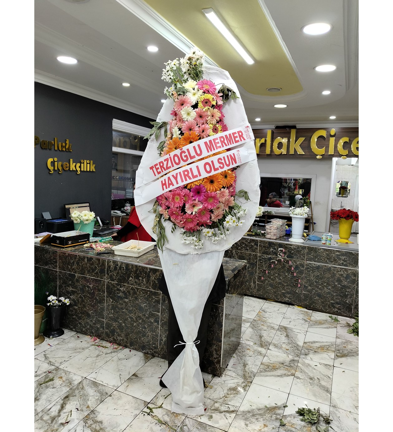 Dikkat Çekici Kontrast: Canlı kırmızı tül çerçeveleme, beyaz çiçeklerin saf görünümünü ön plana çıkararak tören alanında yüksek görünürlük sağlar.
