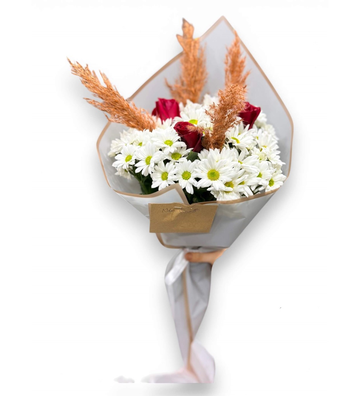 Doğal ve Modern Dokunuş: Buket içeriğindeki taze beyaz papatyalar ve aralara serpiştirilmiş kadife dokulu kırmızı güller, kurutulmuş doğal başaklarla desteklenerek bohem bir şıklık kazanmıştır.