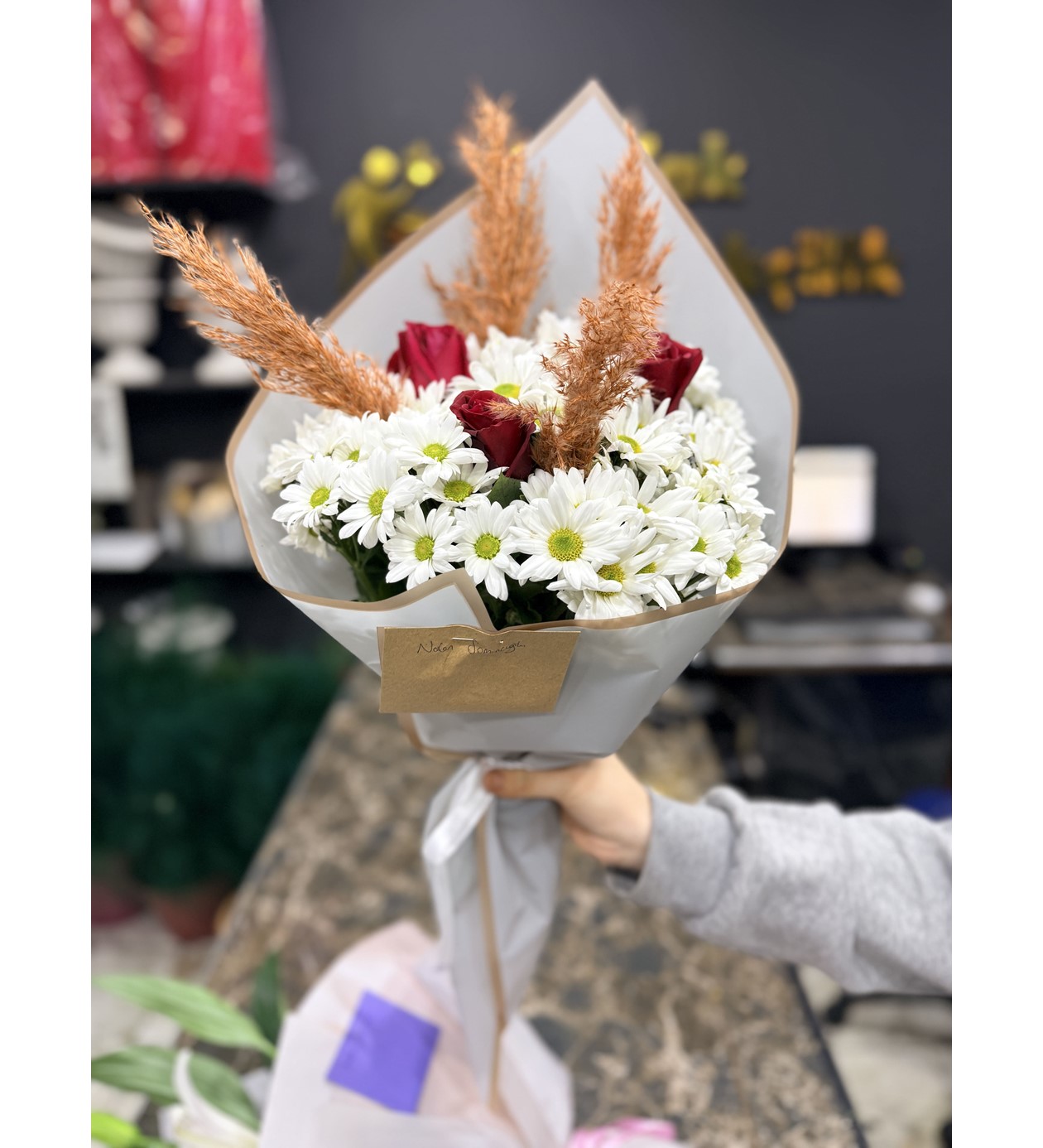 Masumiyetin simgesi beyaz papatyalar ile aşkın sembolü kırmızı gülleri, modern ve doğal bir sunumla bir araya getirdik. Bu özel el buketi, hem sade hem de etkileyici bir hediye arayanlar için floristlerimiz tarafından özenle hazırlandı.