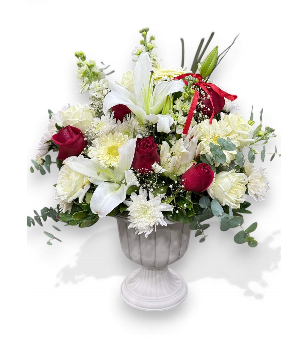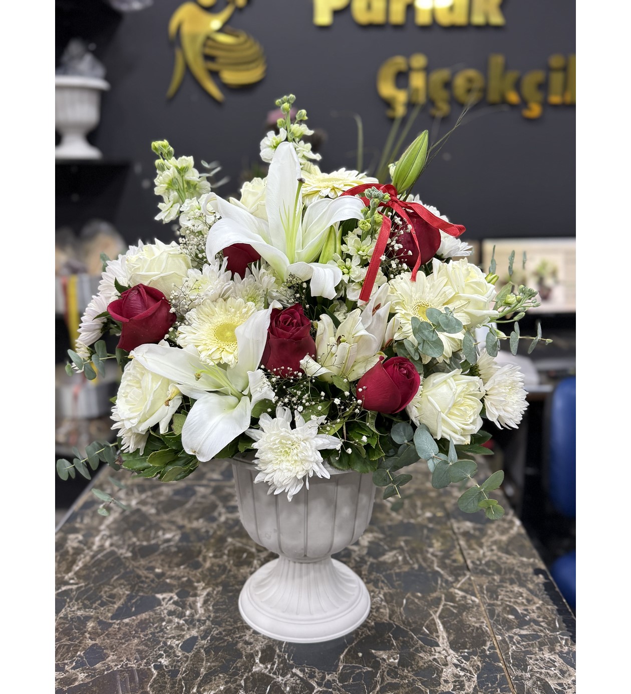 Sevdiklerinize unutulmaz bir sürpriz yapmaya ne dersiniz? Özenle seçilmiş en taze mevsim çiçeklerini, estetik bir antik vazo tasarımında bir araya getirdik. Bu özel aranjman; beyazın huzur veren saflığını yansıtan zambaklar (lilyum), aşkın ve tutkunun simgesi kırmızı güller ve mevsimin en canlı beyaz gerberaları ile harmanlanmıştır.
