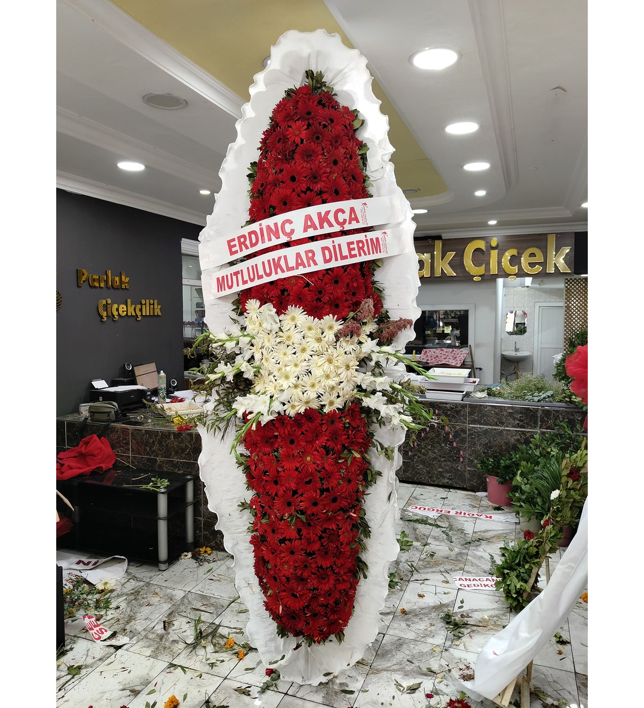 Mutluluğa atılan ilk adımlarda veya yeni bir girişimin açılış heyecanında, varlığınızı en görkemli şekilde hissettirin. Tam boy olarak tasarlanan bu özel çelenk, kırmızının enerjisi ile beyazın zarafetini muazzam bir dengede sunuyor. Yoğun kırmızı gerbera dokusu ve merkezde konumlandırılan beyaz krizantem (papatya) detaylarıyla, klasik çelenk formuna modern ve zengin bir yorum katıyor.